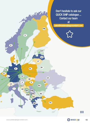 Don't hesitate to ask our QUlCK SHlP catalogue ... Contact our team at sales@wisdomplaygroundsint.com FIN S N EST LV LT BY D PL NL B L CZ UA SK A H MD CH SLO RO I HR BiH SRB RKS BG MNE MK AL GR TR www.wisdomplaygroundsint.com 02